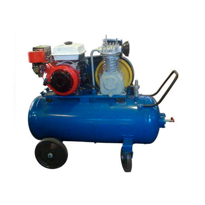 Компрессорная установка с бензиновым двигателем (УМЗ-341 г.Уфа, эксплуатационная мошность - 8 л.с.) на базе компрессорной головки К24М. В отличие от дизельных аналогов у компресора легкий ручной запуск двигателя, более простое обслуживание (отсутствие аккумулятора, более легкий, компактный).