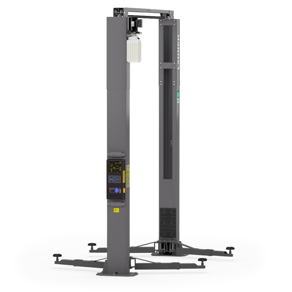 Двухстоечный электрогидравлический подъемник Launch TLT-240SCA с верхней синхронизацией, грузоподъемностью 4 тонны (европейская сертификация CE). Подходит для обслуживания легковых автомобилей, SUV и стандартных микроавтобусов. Цвет – серый.